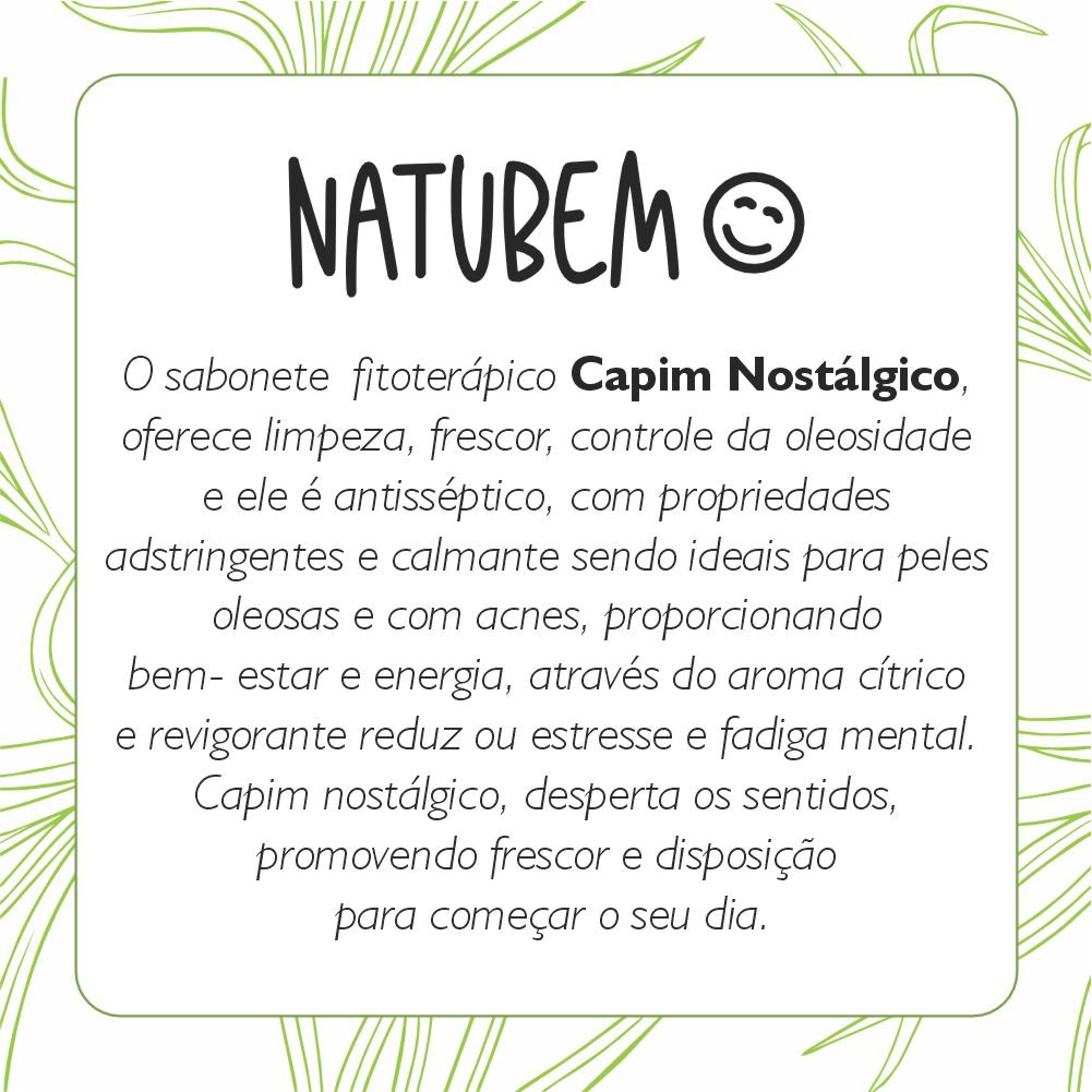 O sabonete fitoterápico capim nostálgico, oferece limpeza, frescor, controle da oleosidade e ele é antisséptico, com propriedades adstringentes e calmante sendo ideais para peles oleosas e com acnes, proporcionando bem- estar e energia, através do aroma cítrico e revigorante reduz ou estresse e fadiga mental.